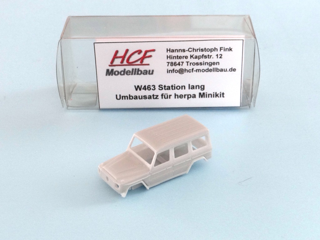 Detailgetreuer Umbausatz aus Resin für z.B. Herpa MiniKit (Herpa Modell nicht enthalten) zur Nachbildung des W463 mit langem Radstand im Maßstab 1:87.